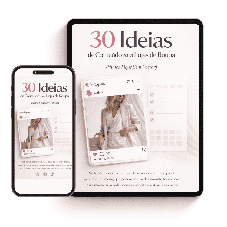 Neste bônus você vai receber 30 ideias de conteúdo prontas para lojas de moda, que podem ser usadas durante todo o mês para manter suas redes sociais sempre ativas e atrair mais clientes.