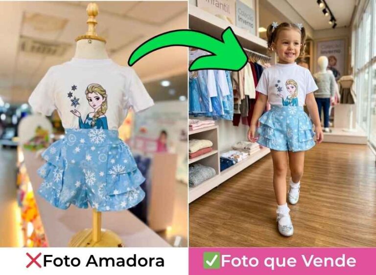 A IA identifica a peça e transforma automaticamente em uma modelo real vestindo a roupa, com cenário profissional.